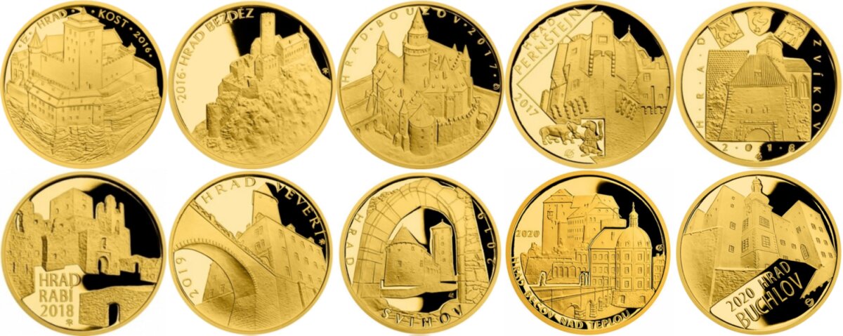 Komletní sada mincí Hrady vydávanou v letech 2015 - 2020 provedení b.k./ bežná kvalita